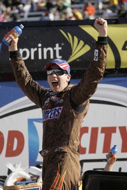 Kyle Busch celebrates winning the Food City 500 at Bristol Motor Speedway. The win was Busch’s 14th in his career and second at Bristol. (Photo credit: CIA STOCK PHOTO)