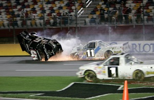 Skinner’s No. 5 Toyota spun out of control, slid up the track at the entrance to Turn 1 and took a vicious hit from the Toyota of T.J. Bell. Skinner’s Tundra slammed into the outside wall, tipped up on its side and slid toward the infield in a shower of sparks before righting itself.