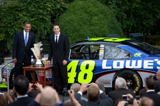 President Obama – In terms of individual sports, you’ve got some folks like Tiger Woods, and Roger Federer in tennis, who have established dominance in their sport. Jimmie is somebody who obviously, and his whole team, knows what they’re doing and knows how to win. They’re going to have a lot more wins probably under their belt in the future. He looks like a pretty young guy. I saw him getting in and out of the 48 and I was thinking I would have strained something, broke something. He didn’t even tear his suit. That’s the least that would have happened to me – I would’ve had a big rip somewhere.