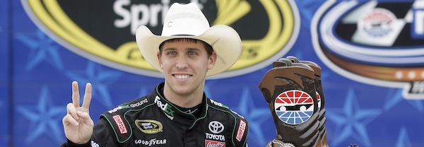 His win Sunday came after race leader and four-time champion Jeff Gordon, along with other frontrunners, were eliminated in a free-for-all accident on an earlier restart. With Jeff Burton leading at the time, Tony Stewart, Gordon, Carl Edwards, Joey Logano, Clint Bowyer, Juan Pablo Montoya, Jamie McMurray and Paul Menard wadded up on the frontstretch trioval with every one of them gunning for the front. It was one of those racing accidents where you just cannot pack twenty pounds in a two-pound sack.