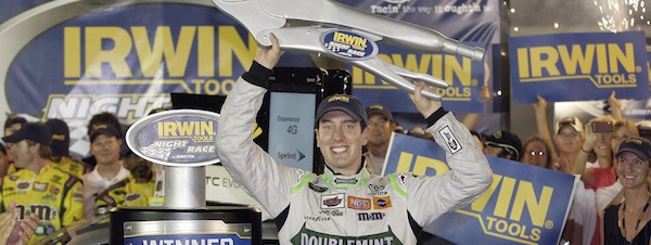 On Lap 429 of 500, Busch nosed past Reutimann after an intense 15-lap battle and pulled away to a Sprint Cup victory that fit quite nicely with his Wednesday win in the Camping World Truck Series and his Friday triumph in the Nationwide Series.