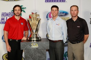 Just an observation, but have a look at this photo (click to enlarge) and tell us the 2010 championship is not Jimmie Johnson’s. Everything in this sport can be read into and body language is certainly one of them. Jimmie Johnson looks confident, is touching the podium & comfortable around the trophy. While Denny Hamlin and Kevin Harvick are awkwardly standing away from it. What do you think?