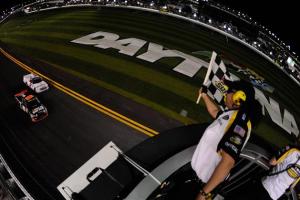 DAYTONA BEACH, Fla.—Ten years to the day from his first victory in the Daytona 500, Michael Waltrip made a slingshot pass of Elliott Sadler at the end of a green-white-checkered-flag finish Friday night to win the NextEra Energy Resources 250 Camping World Truck Series race at Daytona International Speedway.