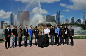 CHICAGO, IL – SEPTEMBER 15: Nascar’s top 12 drivers Kyle Busch, Kevin Harvick, Jeff Gordon, Matt Kenseth, Carl Edwards, Jimmie Johnson, Kurt Busch, Ryan Newman, Tony Stewart, Dale Earnhardt Jr., Brad Keselowski and Denny Hamlin pose with the Sprint Cup trophy in front of Buckingham Fountain during Nascar Chase for the Sprint Cup Media Day on September 15, 2011 in Chicago, Illinois. (Photo by David Banks/Getty Images for Nascar) *** Local Caption *** Kyle Busch; Kevin Harvick;Jeff Gordon;Matt Kenseth; Carl Edwards; Jimmie Johnson; Kurt Busch; Ryan Newman; Tony Stewart; Dale Earnhardt Jr.;Brad Keselowski; Denny Hamlin