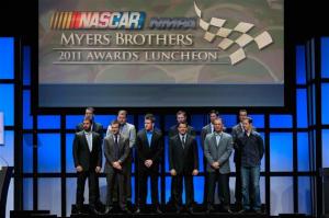 LAS VEGAS, NV – DECEMBER 01: The 2011 top 12 Sprint Cup Series drivers (Top Row L-R) Kyle Busch, Ryan Newman, Jeff Gordon, Dale Earnhardt Jr., Denny Hamlin, Kurt Busch, (Bottom Row L-R) Jimmie Johnson, Matt Kenseth, Carl Edwards, Tony Stewart, Kevin Harvick and Brad Keselowski pose during the NASCAR Sprint Cup Series Champion’s Week NMPA Myers Brothers Awards Luncheon at the Bellagio on December 1, 2011 in Las Vegas, Nevada. (Photo by Chris Trotman/Getty Images for NASCAR) *** Local Caption *** Brad Keselowski; Tony Stewart; Carl Edwards; Jimmie Johnson
