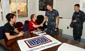 (L to R) Motosports stars Joey Logano and Brad Keselowski shake hands with sailors stationed in Guantanamo Bay, Cuba as part of a NASCAR-USO visit on December 13, 2011. This is the first USO tour for Logano and Keselowski. USO photo by Mike Clifton