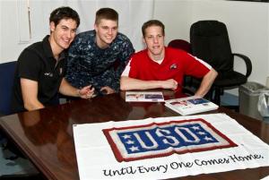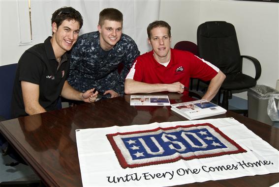 (L to R) Motosports stars Joey Logano and Brad Keselowski pose for a photo with U. S. Navy MA3 Brock Rowe, 22, from Greene, NY during a USO visit to Guantanamo Bay, Cuba on December 13, 2011. This is the first USO tour for Logano and Keselowski. USO photo by Mike Clifton