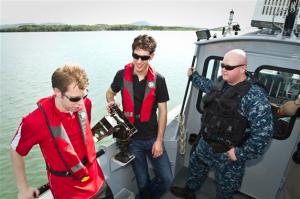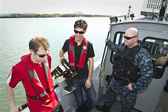 (L to R) Motosports stars Brad Keselowski and Joey Logano enjoy a boat tour of Guantanamo Bay by U. S. Navy MASN Zachary Cooney, 26, of Ferndal, CA as part of a NASCAR-USO tour on December 13, 2011. This boat tour was one of many USO tour stops in the island nation. USO photo by Mike Clifton