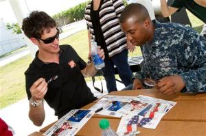 Motosports star Joey Logano smiles on as U. S. Navy HM3 Chris Spencer trades autographs during a NASCAR-USO meet and greet at U. S. Naval Hospital in Guantanamo Bay, Cuba on December 13, 2011. This is Logano’s first-ever USO tour. USO photo by Mike Clifton