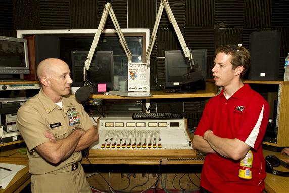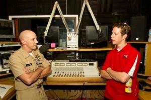 Motosports star Brad Keselowski takes time out of his NASCAR-USO tour to Guantanamo Bay, Cuba to be interviewed on AFN Radio by U. S. Navy Chief Stan Travioli, 40, of Terre Haute, IN. This is Keselowski’s first USO tour. USO photo by Mike Clifton