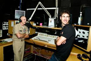 Motosports star Joey Logano takes time out of his NASCAR-USO tour to Guantanamo Bay, Cuba to be interviewed on AFN Radio by U. S. Navy Chief Stan Travioli, 40, of Terre Haute, IN. This is Logano’s first USO tour. USO photo by Mike Clifton