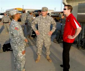 Motorsports star Brad Keselowski talks one-on-one with soldiers outside the Kittery Cafe in the Joint Task Force Area in Guantanamo Bay, Cuba as part of a NASCAR-USO visit on December 13, 2011. This is Keselowski’s first USO tour. USO photo by Mike Clifton