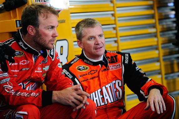 CONCORD, NC – MAY 24: Kevin Harvick, driver of the #29 Budweiser Folds of Honor Chevrolet, talks with Jeff Burton, driver of the #31 Wheaties Chevrolet, in the garage during practice for the NASCAR Sprint Cup Series Coca-Cola 600 at Charlotte Motor Speedway on May 24, 2012 in Concord, North Carolina. (Photo by Jared C. Tilton/Getty Images for NASCAR)