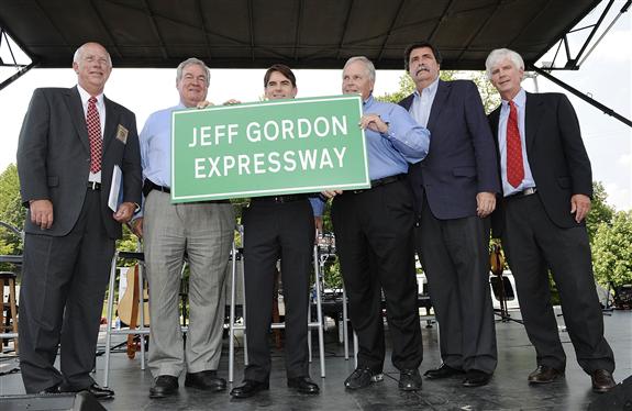 CHARLOTTE, NC – MAY 25: (L-R)Jim Pendergraph, Vice-Chair Mecklenburg County Board of Commissioners, Eugene A. Conti, Jr., Secretary N.C. Department of Transportation, Jeff Gordon, driver of the #24 Drive to End Hunger Chevrolet, Rick Hendrick, owner of Hendrick Motorsports, Mike Helton, president of NASCAR, and John Collett, Member N.C. Board of Transportation, poses for a photo after naming a section of I-85 Jeff Gordon Expressway at Hendrick Motorsports on May 25, 2012 in Charlotte, North Carolina. (Photo by Jared C. Tilton/Getty Images for NASCAR) *** Local Caption *** Jim Pendergraph;Eugene A. Conti;Jeff Gordon;Rick Hendrick;Mike Helton;John Collett
