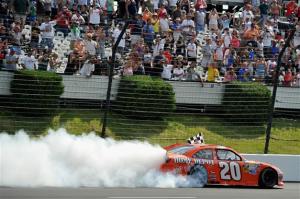 LONG POND, PA – JUNE 10: Joey Logano, driver of the #20 The Home Depot Toyota, celebrates with a burnout after winning the NASCAR Sprint Cup Series Pocono 400 presented by #NASCAR at Pocono Raceway on June 10, 2012 in Long Pond, Pennsylvania. (Photo by Drew Hallowell/Getty Images)