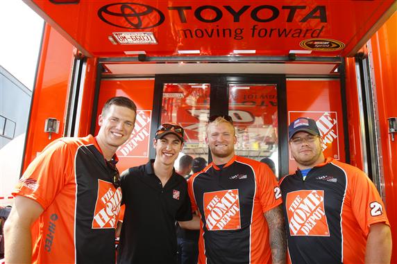 Joey Logano with New England Patriots players Zoltan Mesko, Nick McDonald and Ryan Wendell