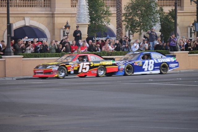 2012 NASCAR Victory Lap Las Vegas Burn Outs – Clint Bowyer pushes Jimmie Johnson
