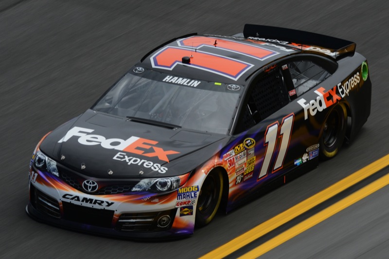 DAYTONA BEACH, FL – FEBRUARY 16: Denny Hamlin, driver of the #11 FedEx Express Toyota, during practice for the NASCAR Sprint Cup Series Daytona 500 at Daytona International Speedway on February 16, 2013 in Daytona Beach, Florida (Photo by Jared C. Tilton/NASCAR via Getty Images)