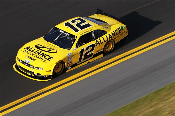 DAYTONA BEACH, FL – FEBRUARY 22: Sam Hornish Jr., driver of the #12 Alliance Truck Parks Ford, qualifies for the NASCAR Nationwide Series DRIVE4COPD 300 at Daytona International Speedway on February 22, 2013 in Daytona Beach, Florida. (Photo by Todd Warshaw/Getty Images)