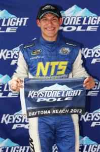 DAYTONA BEACH, FL – FEBRUARY 22: Brennan Newberry, driver of the #14 Fight For Life Chevrolet, poses with the Keystone Light Pole position flag after qualifying first for the NASCAR Camping World Truck Series NextEra Energy Resources 250 at Daytona International Speedway on February 22, 2013 in Daytona Beach, Florida. (Photo by Tom Pennington/NASCAR via Getty Images)