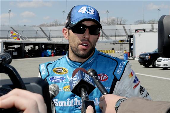 Aric Almirola driver of the # 43 Smithfield Ford, Talks to the media during testing at Richmond International Raceway. ( Photo By John Harrelson/Harrelson Photography Inc.)