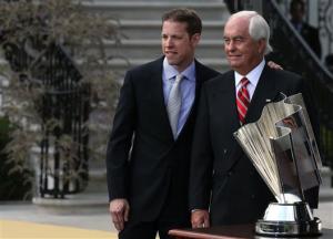WASHINGTON, DC – APRIL 16: Sprint Cup Champion Brad Keselowski (L) stands with team owner Roger Penske, next to the Sprint Cup Trophy, during an event at the White House, April 16, 2013 in Washington, DC. President Obama hosted the event to honor Keselowski, the 2012 NASCAR Sprint Cup Series Champion. (Photo by Mark Wilson/Getty Images)