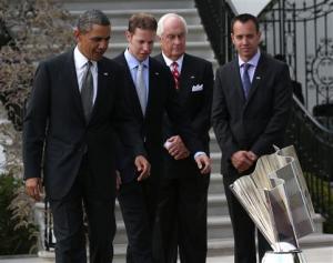 WASHINGTON, DC – APRIL 16: (L-R) U.S. President Barack Obama, Sprint Cup Champion Brad Keselowski, Owner Roger Penske and Crew Chief Paul Wolfe attend an event at the White House, April 16, 2013 in Washington, DC. President Obama is hosted the event to honor Keselowski the 2012 NASCAR Sprint Cup Series Champion. (Photo by Mark Wilson/Getty Images)