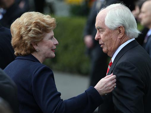 WASHINGTON, DC – APRIL 16: Sen. Debbie Stabenow (D-MI) (L) talks with team owner Roger Penske during an event at the White House, April 16, 2013 in Washington, DC. President Obama hosted the event to honor Brad Keselowski the 2012 NASCAR Sprint Cup Series Champion. (Photo by Mark Wilson/Getty Images)