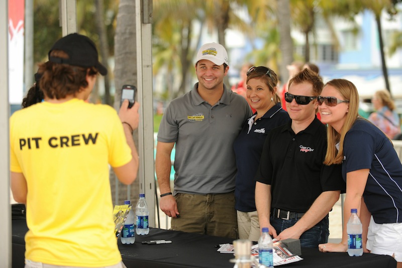 Reed Sorenson (4th from right) and Jason Leffler (2nd from right) pose for a photo with fans during the Coca-Cola Fuels NASCAR Championship Drive on Miami Beach on November 18, 2010. Marc Serota / Getty Images for NASCAR
