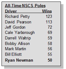Newman has won at least one pole at 17 different tracks, the most coming at Charlotte (nine).