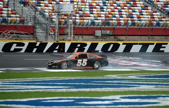 CONCORD, NC – OCTOBER 14: Brett Moffitt, driver of the #55 Michael Waltrip Racing Toyota, spins through the tri-oval during NASCAR Sprint Cup Series testing at Charlotte Motor Speedway on October 14, 2013 in Concord, North Carolina. (Photo by Rainier Ehrhardt/NASCAR via Getty Images) *** LOCAL CAPTION *** Brett Moffitt