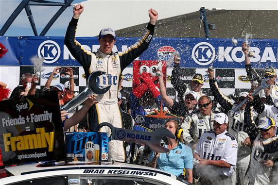 LAS VEGAS, NV – MARCH 09: Brad Keselowski, driver of the #2 Miller Lite Ford, celebrates in victory lane after winning the NASCAR Sprint Cup Series Kobalt 400 at Las Vegas Motor Speedway on March 9, 2014 in Las Vegas, Nevada. (Photo by Todd Warshaw/Getty Images)