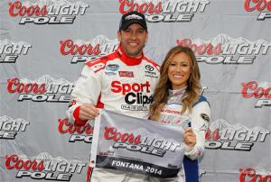 FONTANA, CA – MARCH 22: Elliott Sadler, driver of the #11 GameStop-Turtle Beach Toyota, celebrates setting the pole position during qualifying for the NASCAR Nationwide Series TREATMYCLOT.COM 300 at Auto Club Speedway on March 22, 2014 in Fontana, California. (Photo by Brian Lawdermilk/NASCAR via Getty Images)