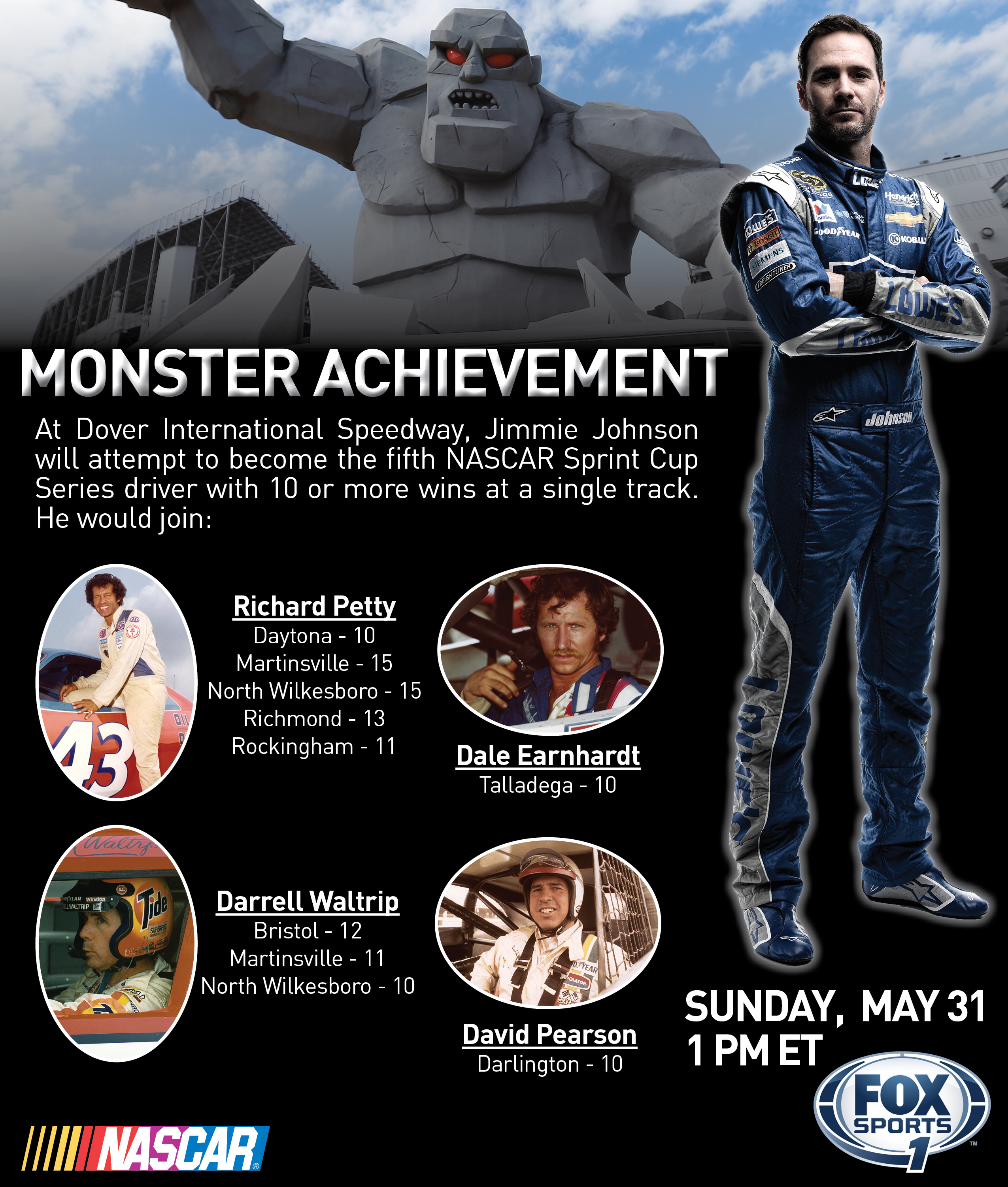 Jimmie Johnson’s success at Dover is a Monster Achievement. Four NASCAR Sprint Cup Series drivers have recorded 10 or more wins at a single track. This weekend, Johnson looks to become the fifth.