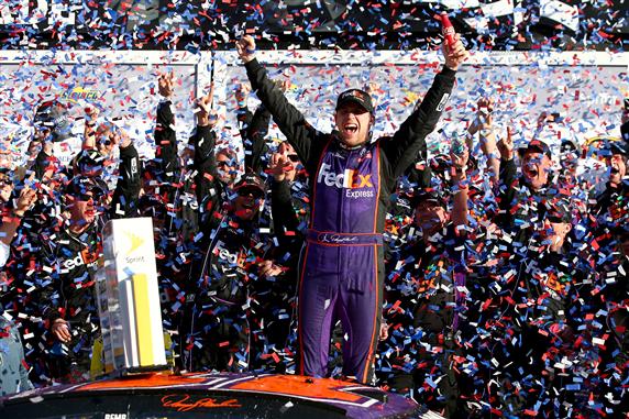In a wild last lap at the 2.5-mile superspeedway, Hamlin moved into the outside lane in front of Kevin Harvick, who had gained momentum up top. Avoiding a block from JGR teammate Matt Kenseth in Turn 4, Hamlin dove to the inside and won a drag race to the finish line against Furniture Row’s Martin Truex Jr.