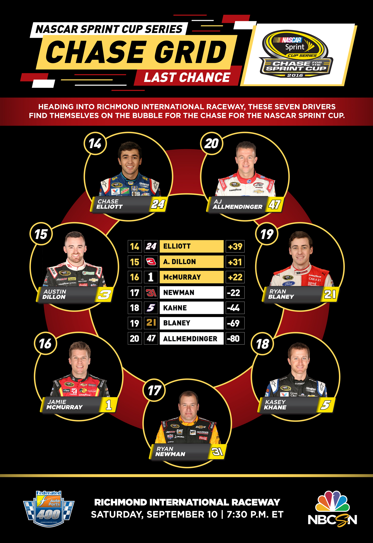 2016: NASCAR Chase Bubble Drivers Before Richmond on September 7, 2016September 7, 2016 Share this: Email a link to a friend (Opens in new window) Email Print (Opens in new window) Print Share on Facebook (Opens in new window) Facebook Share on X (Opens in new window) X Share on Pinterest (Opens in new window) Pinterest Share on Reddit (Opens in new window) Reddit Like Loading... Related