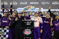 DAYTONA BEACH, Fla. – With the car of Ryan Newman sliding upside-down trailing sparks behind him, Denny Hamlin joined elite company on Monday night in the second-closest finish in Daytona 500 history.