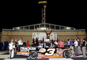 After leading from Laps 59 to 82, Edwards made a yellow flag pit stop but approached his stall a bit too fast, and was forced to restart in the 14th position. However, it took him only 39 laps to regain the lead and backflip his way into victory lane in Nashville for the sixth time in his career—five times in the Nationwide Series and once in the NASCAR Camping World Truck Series.
