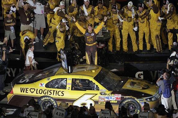 At Daytona in February, Ragan gave away a chance to win the Daytona 500 when he changed lanes before the start/finish line on a restart. On Saturday, however, he got a strong push from Roush Fenway Racing teammate Matt Kenseth and won the race under caution when a massive wreck on the final lap brought out the final yellow flag.