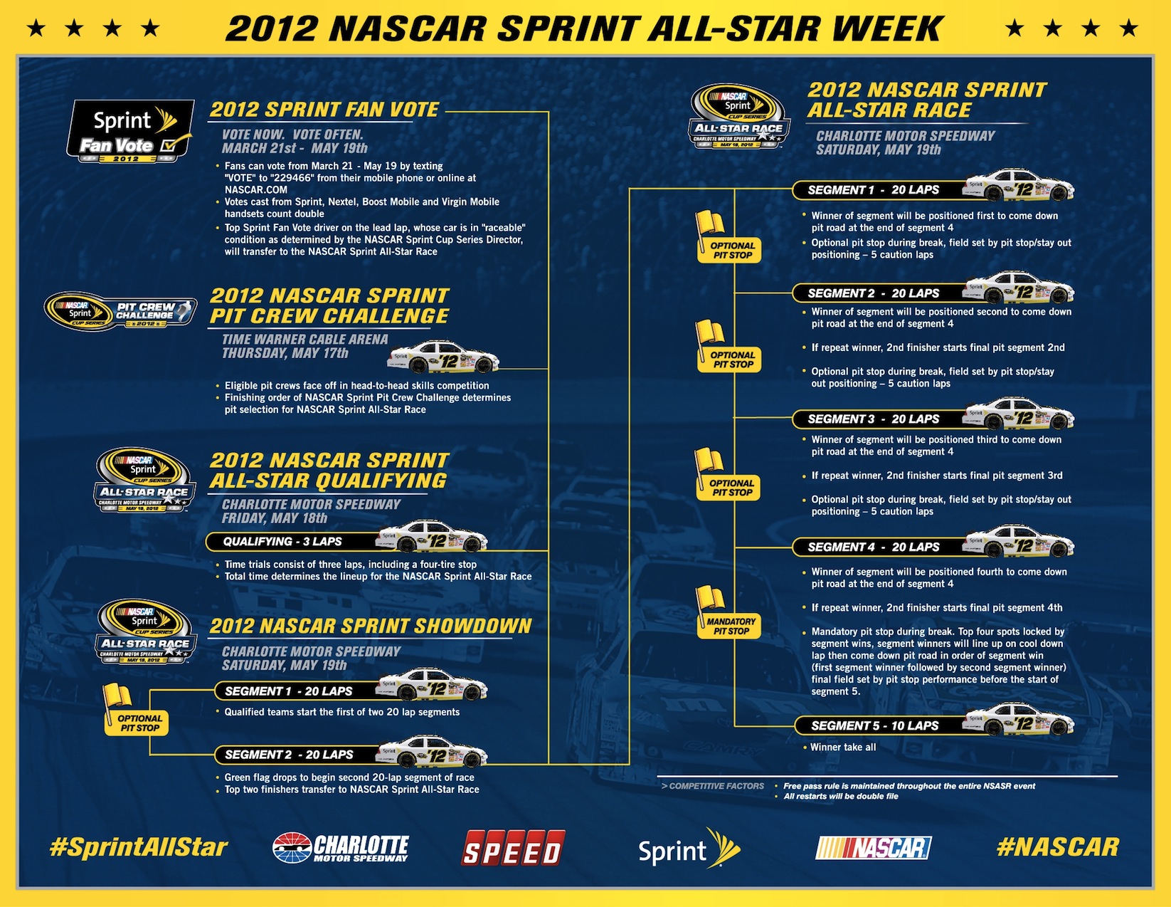 DAYTONA BEACH, Fla. (March 27, 2012) – The 28th running of the NASCAR Sprint All-Star Race will provide some additional incentive for drivers to win one of the four segments heading into the final 10-lap shootout, as the emphasis on winning and pit road strategy have never been more prevalent in this special night of NASCAR star-studded competition. Through the annual Sprint Fan Vote, under way now, fans can again cast ballots for their favorite eligible driver. The driver receiving the highest number of votes will earn a spot in the field.