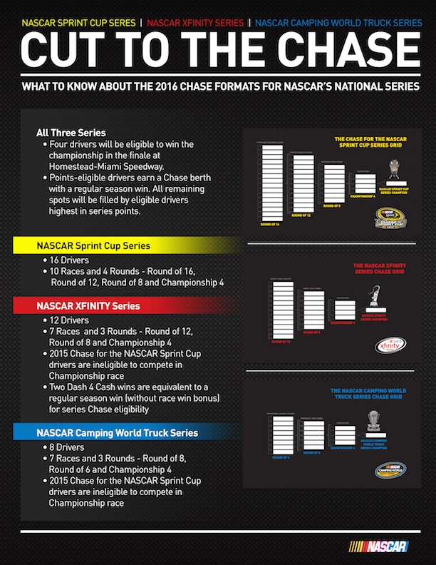 “Fans, partners and the industry have embraced the new Chase format like nothing we’ve seen in the sport’s history,” said France. “Winning never has been this important, and the excitement generated the past two seasons in the Sprint Cup Series has led to this implementation of the Chase format in all three national series. Competition in both the NASCAR XFINITY Series and NASCAR Camping World Truck Series will undoubtedly elevate to new heights and shine a spotlight on the rising stars of our sport.”