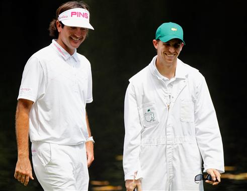 NASCAR driver Denny Hamlin looks on as he caddies for Bubba Watson during the Par 3 Contest prior to the start of the 2012 Masters Tournament at Augusta National Golf Club on April 4, 2012, in Augusta, Ga.