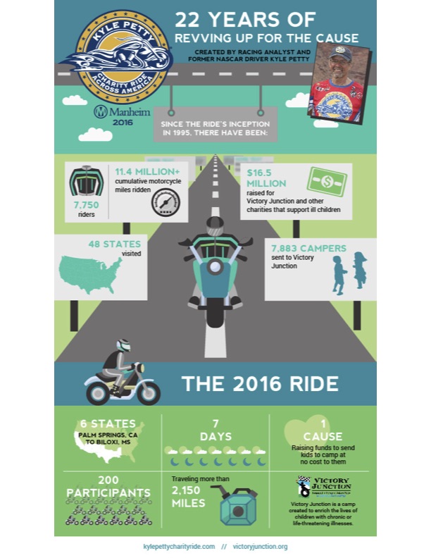 “We ride every mile, from the Palm Desert to the Gulf Coast and all the incredible miles in between, first and foremost for the children at Victory Junction,” said Petty. “Each year, the Ride creates lasting memories and gives riders the chance to check items off their travel bucket lists. This year will include the Ride’s first visit to Big Bend National Park.” Continue reading “2016 Kyle Petty Charity Ride Across America Kicks Off This Weekend”