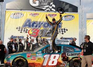 TALLADEGA, Ala. — With a slingshot move past Sprint Cup teammate Kyle Busch five laps into overtime, Joey Logano won Saturday afternoon’s Aaron’s 312 NASCAR Nationwide Series race at Talladega Superspeedway.